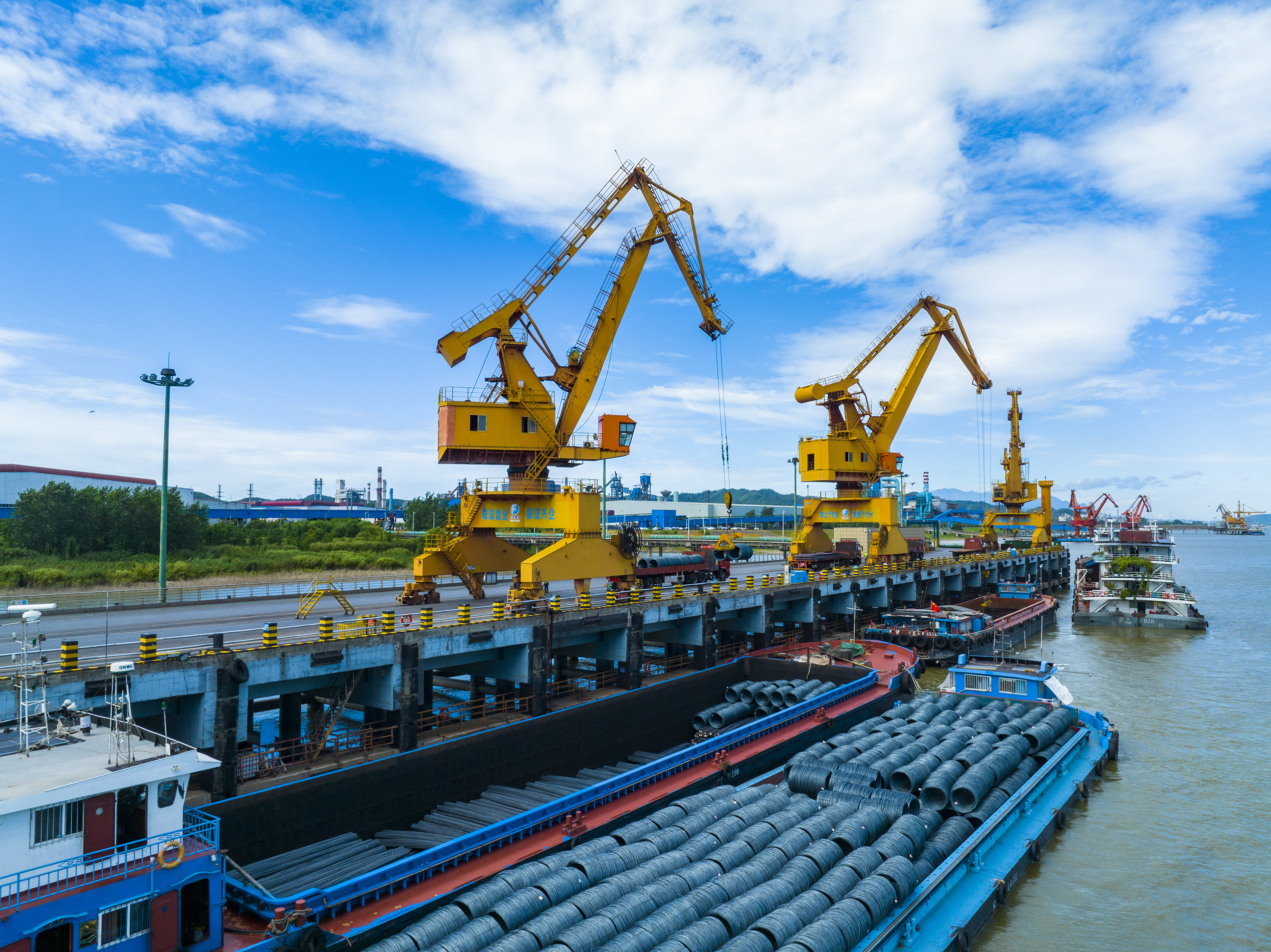 在方大集团九江萍钢钢铁有限公司位于长江边的码头,塔吊在装卸货物。新华社发(张玉摄)