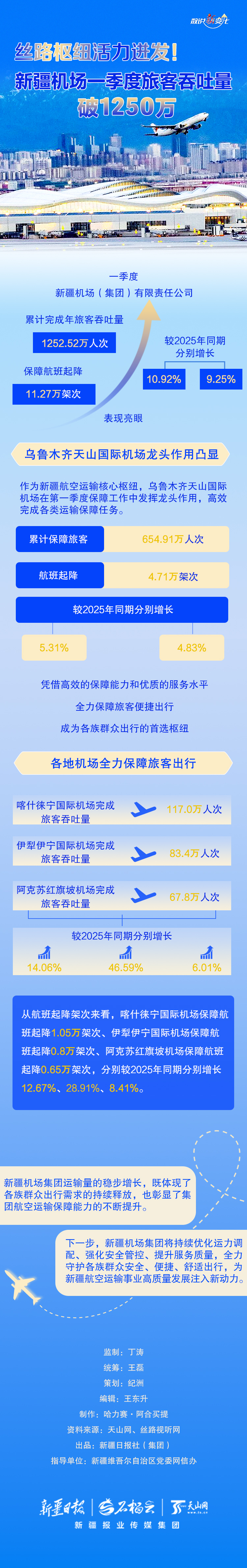 一季度,新疆机场有限责任公司累计完成年旅客吞吐量1252.52万人次,保障航班起降11.27万架次,较2025年同期分别增长10.92%和9.25%,表现亮眼。一季度,新疆各机场完成多少旅客吞吐量?较去年增长多少?今天的《数说新变化》一起来看看。