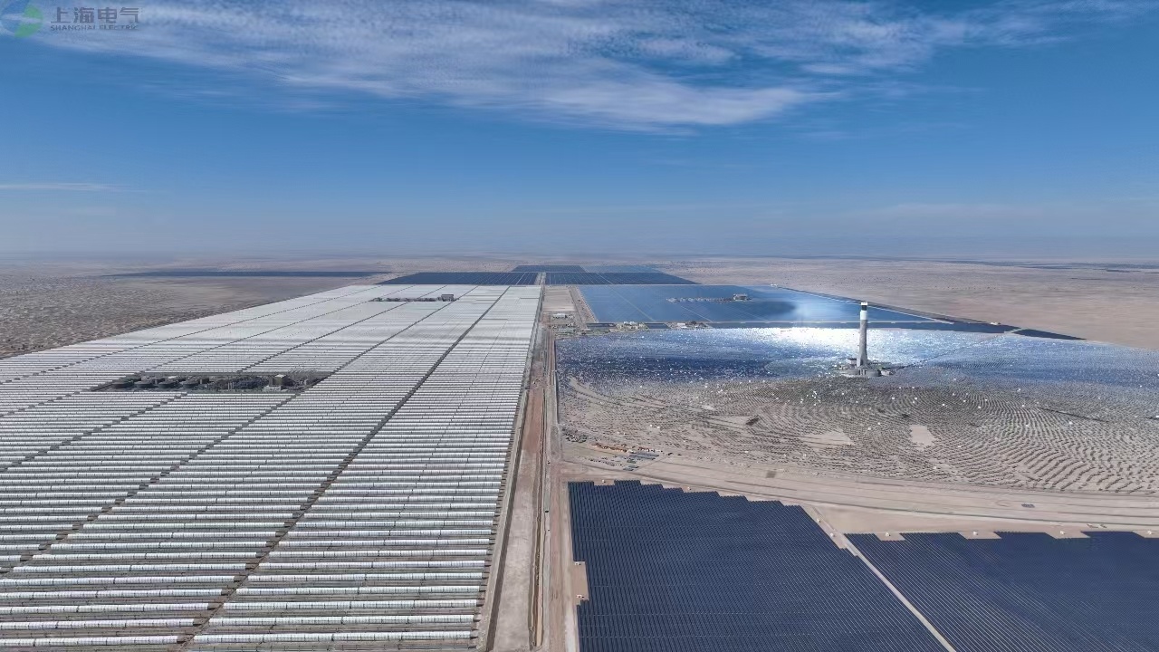 在阿拉伯联合酋长国迪拜的沙漠深处,一片蔚蓝的光伏板海洋在烈日下熠熠生辉:巍然耸立的262米集热塔与周围约7万面定日镜组成的巨大镜场,共同构成全球规模最大的光热光伏复合电站。6000多套槽式集热器在相当于6000多个标准足球场面积的园区中协同运作,捕捉沙漠中充沛的太阳能,并将其源源不断转化为清洁电能。